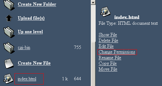 After selecting the link the right menu will update itself and show you a list of things you can do to the file/directory. At this point select "Change Permissions. A box like below will load: