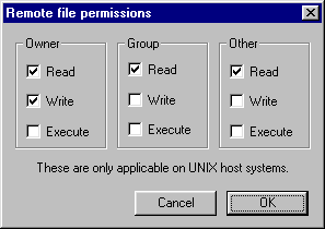 permission types. 1. set plain html pages to rw- for the user, no permission for the group, and r--for world (default) 2. set scripts to rwx for the user, r-x for the group, and r-x for world 3. set data/config files to rw- for the user, no permission for the group, and rw- for world Select "Change" to finish.