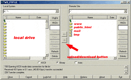 Double click on www to get to your web directory. This is where all your files will be downloaded, and/or you will create subdirectories. The one unique system directory that you may want to use is cgi-bin; this directory is reserved for custom Perl/CGI scripts. To make your home page load automatically, name the HTML document "index.html" in lowercase and upload it to the /www directory of your account. If you access your site (www.yourdomain.com) and see a page that says, "Welcome to your hosting account" that means you have not uploaded your "index.html" file correctly. To upload a file or files, simply highlight the file(s) on the left and click the right arrow button (->) in the center of the window. Be sure to upload HTML documents and scripts in ASCII mode and images in Binary mode. To transfer a file to a subdirectory, double-click the appropriate subdirectory to open it before transferring the desired file(s). To create a new directory, click on the MkDir button when you are inside the www directory or subdirectory. As soon as a file is uploaded to the web server, it is available for